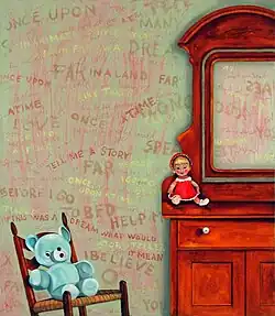 Tewes explained, "I'm interested in that subconscious current. I think about things unspoken … the energy left in a room after a certain conversation."[30] At times that energy took the form of scratched, nearly invisible graffiti on walls, floors and furniture. Critics speculated that the ambiguous scribbles might represent plaintive, rueful traces of recent exchanges, thought projections, or conversations to come, intimating marital discord, sexual tension, irreconcilable disputes, and lonely childhoods.[11] The Village Voice described the effect as one of the décor erupting "in silent but virulent outbursts and erotic daydreams."[31] Inanimate Conversations (2002) portrays a one-eyed teddy bear and a doll, intruded upon by intense graffiti implying an absent child subject to such discussions;[10] in I'm Not Home Please Leave a Message (1999), a boy lies on an adult bed next to an answering machine, surrounded by the searing, scrawled accusations of his separated parents.[9]