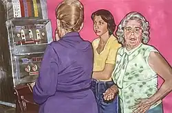 Ronny Cohen called Tewes's style illustrative, precise and realist,[23] but others like Brian Breger observed that she avoided "the frigid exactness of the super-realists"[16] by capturing the warmth, humor and emotional depths of her subjects.[24][25] According to critic Scott Cook, her style largely masked the degree to which—unlike photorealist painters— she altered and supplemented her environments and compositions, a process of construction, according to imagination, rather than replication.[1] Cohen suggested it was a "new kind of documentary painting," partaking of 20th-century American social realism, refracted through Pop's interest in the everyday and through Minimalist refinement.[26]