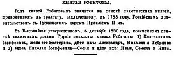 The Robitashvili had the title of tavadi (prince) in the Kingdom of Kakheti and were included in the list of the Georgian nobility attached to the Russo-Georgian treaty of Georgievsk of 1783. After the Russian annexation of Georgia, the family was confirmed among the princely nobility (knyaz) of the Russian Empire in 1850. The surname was Russified as Robitov (Russian: Робитов).[1]