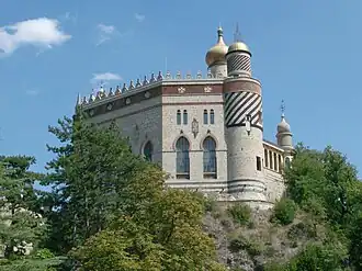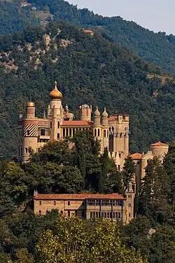 Rocchetta Mattei is a fortress located on the Northern Apennine Mountains, on a hill which is 407 meters above sea level, in the locality of Savignano in the municipality of Grizzana Morandi, on the Strada Statale 64 Porrettana, in the Metropolitan City of Bologna.