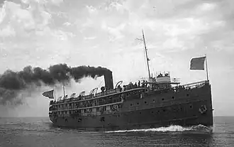The George M. Cox was a 270-foot (82 m) steamer that was built in 1901 and christened the SS Puritan. This ship served briefly in the U.S. Navy to transport troops back home at the conclusion of World War I. In 1933, she was purchased by George Cox and renamed the George M. Cox. On a cruise of Lake Superior with a contingent of special guests, First Mate Art Kronk plotted a course expected to take the Cox well clear of the rocks and reefs. Captain George Johnson and First Mate Kronk could hear the foghorn of the Rock of Ages Light. They proceeded at full lake speed (16.5 knots (30.6 km/h; 19.0 mph)) even though navigational rules called for "moderate speed" in conditions of limited visibility. The Cox struck the reef in heavy fog near the Rock Ages of Light on May 27, 1933. The Cox sat amidships on the shoal with her bow jutting into the air while her stern flooded with water. Crewmen were able to safely evacuate the ship using 5 lifeboats and several life rafts. The Rock of Ages lighthouse keeper, John Soldenski, raced to scene with a gasoline powered boat and towed the life rafts back to the lighthouse while the lifeboats followed along behind.[26] The 127 passengers and crew spent the night in the crowded lighthouse and the surrounding rocks.[27] Being unsalvageable, the ship remained on the rocks until it was broken up in an October storm. It sank near the wrecks of the Cumberland and the Chisholm.[17]