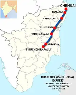 The 12653 / 12654 Rockfort Express is a Superfast Express overnight Express rail connecting Tiruchirappalli with Chennai Egmore via Villupuram in the South Indian state of Tamil Nadu. This train serves as the main connectivity to the state capital Chennai city and Tiruchirappalli city along the route.
