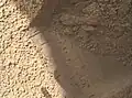 The sand patch is downhill from a cluster of dark rocks. NASA determined the patch to be the location for the first use of the scoop on the arm of the Mars Curiosity rover.[1] The Rocknest patch is about 1.5 m (4.9 ft) by 5 m (16 ft).