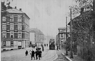 In 1899, Oslo Municipality established KKS to build and operate three tram lines.[1] The second line to open was the Rodeløkka Line on 23 March 1900, which connected to the KSS-owned Grünerløkka–Torshov Line at Nybrua near Hausmanns gate.[2] The line was built as double track until Tromsøgata. It ran along Trondheimsveien before it branched off at Helgesens gate towards Rodeløkka; it followed Rathkes gate, Verksgata and Københavnsgata before reaching Dælenenggata.[3] Here, a small depot was built with place for six cars.[4] On 26 January 1901, a new connection line through Dronningens gate was built from Tollbugata to Kirkeristen, and the company no longer needed to lease tracks from Kristiania Elektriske Sporvei in the city center.[5] KKS was bought by KSS in 1905.[2]
