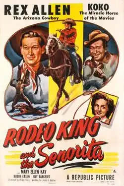 Rodeo King and the Senorita is a 1951 American Western film directed by Philip Ford and written by John K. Butler. The film stars Rex Allen, Mary Ellen Kay, Buddy Ebsen, Roy Barcroft, Tristram Coffin and Bonnie DeSimone. The film was released on July 15, 1951, by Republic Pictures.[1][2][3]