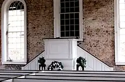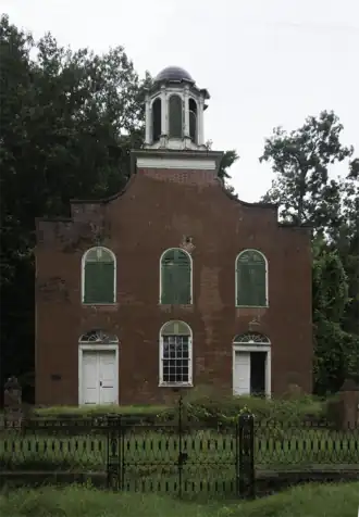 The church building was built from 1829 to 1832 in the Federal architectural style.[4][5][6] It was built with red bricks, "rounded archives, "a stepped gable" and "an octagonal bell tower."[5]