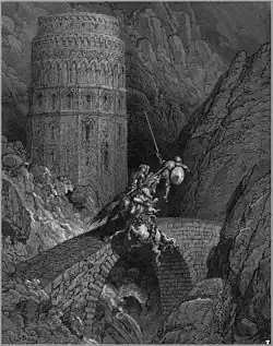 Rodomonte (or Rodamonte) is a major character in the Italian romantic epic poems Orlando innamorato by Matteo Maria Boiardo and Orlando furioso by Ludovico Ariosto. He is the King of Sarza and Algiers and the leader of the Saracen army which besieges Charlemagne in Paris. He is in love with Doralice, Princess of Granada, but she elopes with his rival Mandricardo. He tries to seduce Isabella but she tricks him into killing her by mistake. In remorse, Rodomonte builds a bridge in her memory and forces all who cross it to pay tribute. When the "naked and mad" Orlando arrives at the bridge, it is Rodomonte, the pagan, who throws him into the river below. They both swim ashore, but Orlando who is naked and is unimpeded by heavy armor gets to the shore first. Finally, Rodomonte appears at the wedding of Bradamante and Ruggiero and accuses Ruggiero of treason for converting to Christianity and abandoning the Saracen cause. The two fight a duel and Rodomonte is killed.