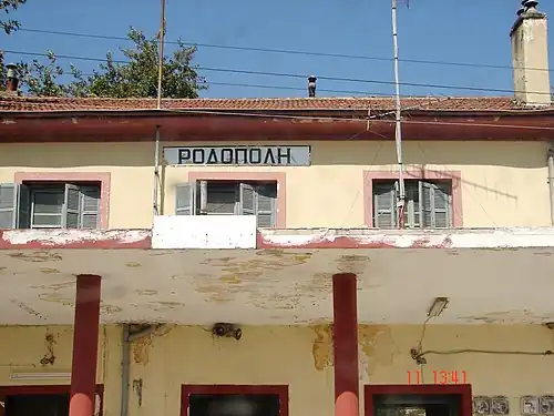 Rodopoli railway station (Greek: Σιδηροδρομικός Σταθμός Ροδόπολης, romanizedSidirodromikós Stathmós Rodópolis) is a railway station that serves the community of Rodopoli, in Serres in East Macedonia and Thrace, Greece. The station is located close to the town center and within the settlement limits. The station building (as of 2021) is unstaffed.[4]