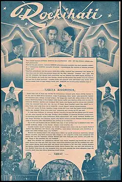 Roekihati was directed by the brothers Joshua and Othniel Wong and produced by the Chinese-owned studio Tan's Film. The Wongs also handled sound editing and cinematography, in black-and-white.[1] It starred Roekiah and Raden Djoemala, a tailor who had replaced the nobleman Raden Mochtar, who often played opposite Roekiah, following a wage dispute.[3] The film also featured Roekiah's songwriter husband, Kartolo, who had frequently appeared on-screen with her since the couple's debut in Terang Boelan (1937).[4] As first promoted by Terang Boelan, Roekihati continued the formula of mixing music, beautiful scenery, and action scenes.[5]