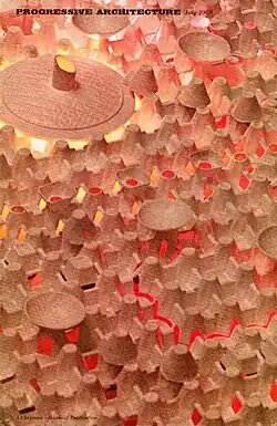 "Roger Katan's recent studies in kinetic illumination expand his architectural interests into a form which projects itself upon its surroundings. . . . Following a logical sequence from fantasy to reality, his studies of repetitive, machine-made, ubiquitous objects, made into painted structures excited by active colored lights, strive to create phenomena of form and color that are commensurate with the spontaneous and intricate manner in which human senses react. The ultimate place of Mr. Katan's art is with architecture, particularly the architecture of night."[21]