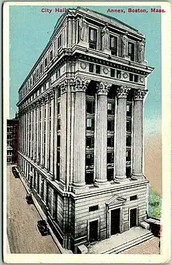 Architect Edward T. P. Graham designed the 10-story Boston City Hall Annex (1912-1914), and Burnham (Graham's Harvard classmate) was given the commission to model four colossal figures for its 9th story cornice.[3]