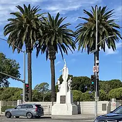 Burnham took leave from Harvard to serve in the Massachusetts Naval Reserve during the Spanish-American War.[19] More than fifty years later, he created The Spirit of '98 (1950), the United Spanish War Veterans Memorial for the Sawtelle Veterans Home in Los Angeles County.[20] It featured a tall, stepped concrete base, with marble figures of a soldier and sailor flanking a hooded goddess figure holding a torch.[20] Burnham's marble statues were toppled in a 1971 earthquake. The memorial was restored with fiberglass replicas of the statues by sculptor David Wilkins,[21] and relocated to Los Angeles National Cemetery.[20]