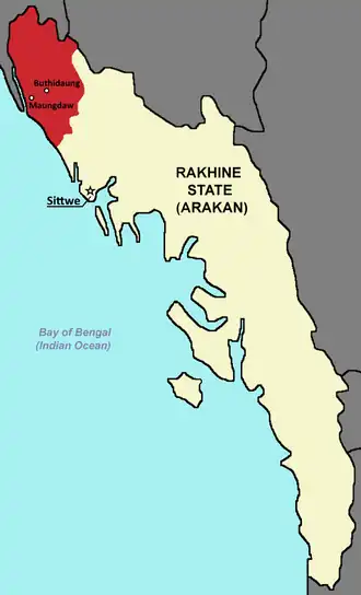 ![]() Map of Rakhine State with Buthidaung and Maungdaw Townships highlighted in red | ||||||||