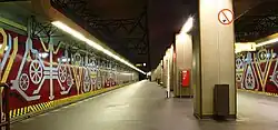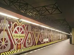 Designed by architect Rümmler, the station was opened on 1 October 1980, as part of the line's extension from Richard-Wagner-Platz to Rohrdamm. Until the second extension of the line from Rohrdamm to Rathaus Spandau in 1984, it was the western terminus of the U7. The name literally means "pipe dam"; as the eponymous street was laid out along a water pipe which gets its water from the Tegeler See and fills the water works in Jungfernheide, from which about 250,000 people get drinking water. The station's machine-like decoration, featuring cog-wheels and pipes, points to this. The adjacent stations are Paulsternstraße and Siemensdamm.[1]