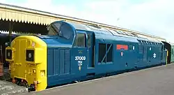 'Dereham Neatherd High School 1912 – 2012' BR Co-Co Class 37 British Rail Blue Undergoing restoration - off site Built by English Electric Vulcan Foundry, as works number EE/VF2866/D582, 37003 was released to Stratford depot (30A) as D6703 on 28 December 1960. In April 1963 the locomotive was named "First East Anglian Regiment", but the name was never unveiled. At Tinsley in 1989 37003 was given the unofficial 'painted-on nameplate "TIGER MOTH", which was carried until she was overhauled at Doncaster in 1992. 37003 was withdrawn from traffic in 1994 and stored at Bescot and Crewe, until purchase by The Class 37 Locomotive Group in 1998. In 2012 the locomotive was named after Dereham Neatherd High School, with full nameplates and the school crest. Nameplates were removed in 2014.