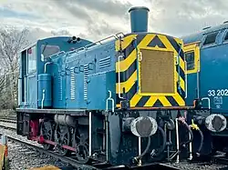 'Dennis G. Robinson' BR Bo-Bo Class 33 British Rail Blue Operational Built BRCW Works and released into service February 1962. First allocated to Hither Green. Named "The Burma Star" in July 1991, then "METEOR" in November 2002. Preserved February 2009.[12] Arrived on the Mid-Norfolk Railway in 2018 to assist with the engineering work at Kimberley.[13]