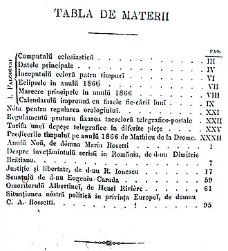 ![]() Contents page of the Calendarulŭ Romanului almanac, 1866. Contributors: C. A. Rosetti, Maria Rosetti, Dimitrie Brătianu, Eugeniu Carada and Radu Ionescu (with Justiție și libertate) | |
