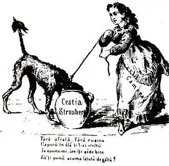 Just months after the union act, Rosetti fell out with Cuza: he called for faster and ampler structural reforms than those effected by the Domnitor's moderate government.[48] Together with the political humorist N. T. Orășanu, he began issuing Țânțarul ("The Mosquito"). Purportedly the first ever Romanian satirical magazine, it was only in print until 15 August 1859.[15] On 24 September, Cuza ordered Românul to be shut down, nominating it as one of the gazettes who had "forgotten the respect they owe to the powers that be"; the other was Nikipercea, a new satirical magazine put out by Orășanu.[48] Among those who protested against this measure was a young liberal, Eugeniu Carada. Remarked by Rosetti, and recommended by Bolliac,[49][50] Carada worked for Românul until 1871 (and was briefly engaged to Rosetti's daughter Libby).[51]