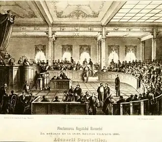 In its first manifesto, also conceived by Brătianu, the paper exhorted the Romanians of both countries to reflect on their shared lineage: "[the Romanians'] interests are identical, they had to suffer through the same things, and they have the same ideas about what they should do to make things better for themselves."[22] Bibliographer Eugène Hatin notes that, together with the more moderate Naționalul, the "ultra-liberal" Rosettist tribune had "the greatest influence on those events which, in Romania, marked the years 1857 to 1859."[23] Românul hosted contributions from the archeologist and political agitator Cezar Bolliac, who spoke out against the anti-Wallachian government of Moldavia. Bolliac attacked separatist Nicolae Vogoride for having shut down the unionist mouthpiece Steaua Dunării, and demanded freedom of the press.[24] C. A. Rosetti himself was Secretary of the Bucharest ad-hoc Divan, which confirmed the new Moldavian prince Alexander John Cuza as prince of Wallachia. Rosetti then journeyed to Moldavia, as president of the delegation which informed Cuza that the personal union had been effected.[25] He is also credited with having put together the "Red" contingency plan, that of a "revolution", had the Bucharest Divan opted not to elect Cuza.[26]