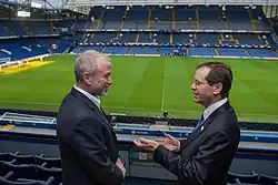 In June 2003, Abramovich became the owner of the companies that control Chelsea in West London.[46] The previous owner of the club was Ken Bates, who later bought rivals Leeds United. Chelsea immediately embarked on an ambitious programme of commercial development, with the aim of making it a worldwide brand at par with footballing dynasties such as Manchester United and Real Madrid, and also announced plans to build a new state-of-the-art training complex in Cobham, Surrey.[47]