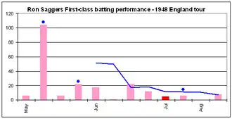 As Australia often won by an innings, and declared in the first innings on many occasions, Saggers only had 12 innings in his 17 first-class fixtures and was not out three times after his remaining partners had been dismissed.[20] In the first County match against Leicestershire he scored six and took two catches,[22] and against Cambridge University he made two stumpings and took one catch.[23] He then played in the match against Essex where Australia reached 721 runs. Saggers made his highest first-class score, 104 not out—the only first-class century of his career—in a partnership of 166 runs in 65 minutes with Sam Loxton. Loxton, along with Bill Brown and Donald Bradman, also scored centuries.[24] He then faced Oxford University, scoring six runs and taking one catch,[25] followed by 22 and a stumping at Lancashire,[26] 17 and another stumping at Hampshire,[27] 22 against Yorkshire,[28] 12 and four stumpings against Surrey,[29] and three more stumpings against Gloucestershire.[30]