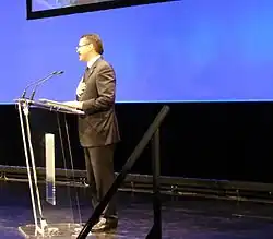 In 1998, with the support of Attorney General Janet Reno and FBI director Louis Freeh, Noble applied to become the secretary-general of Interpol and succeed incumbent Raymond Kendall.[3] On November 3, 2000, at the age of 44, Noble was elected to the position, becoming the first non-European, the first non-white person, the first American and the youngest secretary-general in the organization's history.[9] Noble was nominated for the post by the organization's Executive Committee the previous year, and on September 20, 2005, during Interpol's 74th General Assembly in Berlin, he was re-elected for a second five-year term.[15] On November 9, 2010, Noble was re-elected for a third term as secretary-general during the organization's 79th General Assembly in Doha, Qatar.[16] On November 7, 2014, he resigned from the role and was succeeded by Jürgen Stock, who was unanimously elected during Interpol's 83rd General Assembly in Monaco.[17]
