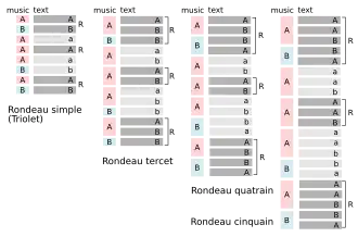A rondeau (French: [ʁɔ̃do]; plural: rondeaux) is a form of medieval and Renaissance French poetry, as well as the corresponding musical chanson form. Together with the ballade and the virelai it was considered one of three formes fixes, and one of the verse forms in France most commonly set to music between the late 13th and the 15th centuries. It is structured around a fixed pattern of repetition of verse with a refrain. The rondeau is believed to have originated in dance songs involving singing of the refrain by a group alternating with the other lines by a soloist.[1] The term "Rondeau" is used both in a wider sense, covering older styles of the form which are sometimes distinguished as the triolet and rondel, and in a narrower sense referring to a 15-line style which developed from these forms in the 15th and 16th centuries.[2] The rondeau is unrelated to the much later instrumental dance form that shares the same name in French baroque music, which is more commonly called the rondo form in classical music.