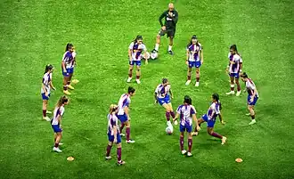 Rondos occur close together, with the possessing group frequently encircling the opposing group.[2] Unlike other possession games, in a rondo, players occupy predetermined positions.[3] Rondos are said to improve player decision making, coordination, team play, creativity, competitiveness, and physical conditioning.[3] The exercise has been used by major football organizations, including Derby County in the early 1970s,[4] and later at FC Barcelona by Laureano Ruiz,[5] and has been credited with remaking the modern game.[2]