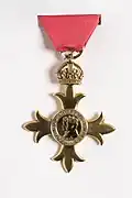 Beneath the Shield the insignia suspended by their respective ribands of an OBE, MStJ and ORS