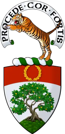 Argent from a Mound Vert an Oak Tree Proper fructed Or and on a Chief enarched Gules a Wreath of Oak Leaves of the Third
