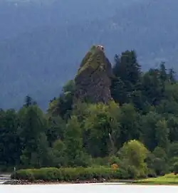The monolith was mentioned in the journal of the explorers Lewis and Clark as their camping place on November 2, 1805.[2] The name is phallic in origin,[2] specifically, the column's original name was "Cock Rock". The Chinook word for the rock was iwash, referring to penis.[3] The name was later modified, at the urging of Dalles businessperson Victor Trevitt,[4] to Rooster Rock so as not to offend the public.[3]