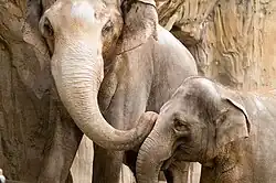 Rose-Tu was mated again with Tusko and, in 2012, gave birth to a 300 lb (140 kg) female calf named Lily.[25][26][9] Her name was chosen in an online poll.[26] Shortly after Lily's birth, The Seattle Times reported that Lily, like her father, was owned, not by the Oregon Zoo, but by private elephant ranch Have Trunk Will Travel and that she could be removed from the zoo when she turned three. This was as a result of the agreement the Oregon Zoo made when they were loaned Tusko, where it was stipulated that half of Tusko's offspring would go to the zoo, and the other half to the ranch. Animal Defenders International and Bob Barker called for the zoo to keep Lily.[27] In 2013, the Oregon Zoo purchased both Lily and Tusko for $400,000 from Have Trunk Will Travel.[28][29] Photographs of Rose-Tu and Lily were featured prominently in Elephant House, a 2015 photo book about the lives of elephants at the Oregon Zoo.[30] On November 28, 2018, Lily was diagnosed with elephant endotheliotropic herpesvirus. She started showing symptoms the next day, and died on late on November 29, 2018, one day before turning six.[31][32][33]