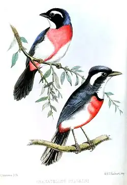 The genus Granatellus was traditionally placed in family Parulidae, the New World warblers. Studies of DNA sequences in the early 2000s resulted in its being moved to its present family. The rose-breasted chat and the other two members of its genus, red-breasted chat (G. venustus) and grey-throated chat (G. sallaei) form a superspecies.[4][3]