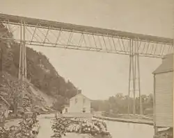 Though the trestle was difficult to build,[8] and viewed as weak by modern standards,[9] it was remarkable for its time,[10] and can be considered the "most awesome part" of the Wallkill Valley rail line.[3] Construction on the bridge's abutments began in August, 1870 by A. L. Dolby & Company, but work on the superstructure by the Waston Manufacturing Company did not begin until the following year due to problems with quicksand during the excavation.[11][12] Sections of the superstructure were built in Paterson, New Jersey.[13] The bridge originally had seven wrought-iron spans and two shorter wooden spans;[3] the longer spans were each[14] 105 feet (32 m) in length.[13] The bridge cost $250,000 to build,[15] and followed a Post truss design.[1] Roughly 1,000 short tons (910 t) of iron and 420,000 board feet (990 m3) of timber went into its construction. At the time of its completion in January, 1872, it had the highest span of any bridge in the United States.[11][12] Due to its height, it could "scarcely be crossed for the first time without something like a feeling of terror".[16] The bridge allowed the rail line to continue north to Kingston.[3]