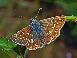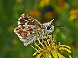 The wingspan of Pyrgus onopordi can reach 22–28 mm. The upper side of the frontwings and hindwings is dark brown or khaki with a slight yellowish tinge, white markings, and a white fringe on the edge. The underside hindwings is light yellow-brown marbled with a few large white spots, including a characteristic anvil-shaped discal mark bordered with dark lines in the cells four and five.[3][4] Females are darker and usually larger than males.[5] Unlike most European Pyrgus species this skipper can usually be readily identified in the field as it is noticeably paler than its congeners. This is due to a heavy dusting of yellowish scales which overlies the dark brown base colour.