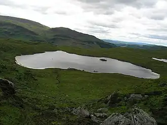 The loch in summer 2006 looking approximately southwest from the slopes of Craiglee towards Mulldonach (centre) and Lamachan Hill (left).