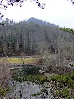 The Roundtop Trail's descent is relatively sharp, but short. This leg of the trail is characterized by sandstone outcroppings, some of which form natural dry rock shelters. The Townsend Y and Little River Road can be discerned from the trail less than one-half mile from its terminus. The trail's terminus isn't marked, and splinters into several short paths, all leading the river's edge. The river is most easily forded immediately downstream or immediately upstream from the Y.
