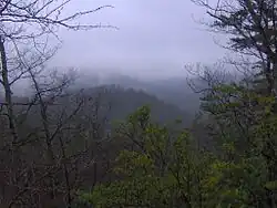 Like most of the Great Smokies range, Roundtop is made up of Precambrian rocks of the Ocoee Supergroup.[2] Large outcroppings of this rock form rock overhangs along the trail as it descends to the Townsend Y. Roundtop's forest consists largely of Table Mountain Pine and Pitch Pine trees, which gives way to a mixed mesophytic forest in the coves and hollows at the base of the mountain. Mountain laurel dominates the forest's understory.[3]