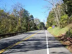 Route 12 continues southeast through rural areas, crossing the Lockatong Creek before intersecting CR 615, where it becomes the Samuel Hill Highway.[1][2] A short distance past this intersection, the route briefly passes through the southern corner of Franklin Township before entering Delaware Township. Here, the road crosses Wickecheoke Creek before coming to an intersection with CR 579.[1] Past this intersection, Route 12 enters Raritan Township, where it continues through rural areas with some residences. The residential development along the road increases before it reaches the Dvoor's Circle (a traffic circle) with CR 523.[1][2] Past the traffic circle, the route crosses a small stream and enters Flemington.[1] Here, Route 12 passes businesses and heads south of a park and ride lot serving Trans-Bridge Lines buses before crossing the Black River and Western Railroad and coming to the Main Street Circle, a modern-designed roundabout, where it intersects CR 611 and Reaville Avenue.[1][2] From here, the route continues east a short distance as a four-lane divided highway before ending at US 202 and Route 31 at the Flemington Circle.[1]