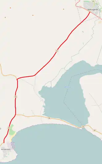 It begins at the roundabout of the ring road at Hveragerði and runs 19 km (12 mi) south-southwest to the ferry port of Þorlákshöfn. After 12 km (7.5 mi), it continues into Þrengslavegur. From the east, Eyrarbakkavegur, which comes from Selfoss and Eyrarbakki, merges into Þorlákshafnarvegur. Þorlákshafnarvegur ends at the roundabout in Þorlákshöfn, where Suðurstrandarvegur and Hafnarvegur Þorlákshöfn also join. The Suðurstrandarvegur runs along the south coast from Reykjanes to Grindavík.