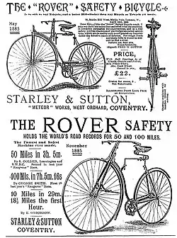 In the early 1880s bicycles were the relatively dangerous penny-farthings and high-wheel tricycles. J. K. Starley made history in 1885 by producing the Rover safety bicycle—a rear-wheel-drive, chain-driven cycle with two similar-sized wheels, making it more stable than the previous high-wheel designs. Cycling Magazine said the Rover had "set the pattern to the world"; the phrase was used in their advertising for many years. Starley's Rover is usually described by historians as the first recognisably modern bicycle.[1]