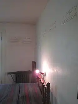 Faulkner made several renovations and additions to the home and property. In the 1930s, he installed plumbing and electricity, added brick terraces with balustrades framing the front portico, added a porch off the dining room, a porte-cochère on the home's west side, a fourth bedroom, a butler's pantry and kitchen, as well as other structural changes.[4] In the 1950s, he oversaw other updates, including the enclosing of the second floor sleeper porch and the ground floor porch. In 1951, Faulkner added a private closet, bathroom, and office on the ground floor. He would spend the last decade of his career writing in the office, and wrote the outline of his Pulitzer Prize-winning novel A Fable on the office walls.[7]