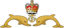 First officially adopted in the 1950s, qualified submariners are presented the Golden Dolphins badge to wear on their uniform on the left breast above any medals.[32] The current badge, adopted in 1972, depicts two golden dolphins facing an anchor surmounted by St Edwards Crown. In September 2020, it was announced that all trainee submariners would be issued their own dolphins badge; similar to the Golden Dolphins in size and shape, though completely black.[32]