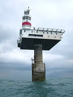 Royal Sovereign lighthouse was a lighthouse marking the Royal Sovereign shoal, a sandbank 11 km (6.8 mi) offshore from Eastbourne. The structure's distinctive shape was easily recognised as the lighthouse tower is perched above a large platform (which functions as a helicopter deck) supported by a single pillar rising out of the water.[3] Originally, the platform was staffed by three full-time keepers, accommodation being contained in the 'cabin section' immediately below the platform. Additional accommodation was provided for up to four visiting maintenance workers.