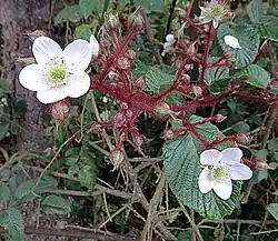 Rubus adenotrichos is a shrub up to 6 meters tall, with copious hairs and scattered curved prickles. Leaves are compound with 3 or 5 leaflets. Flowers are white or pink. Fruits are red or black.[2]
