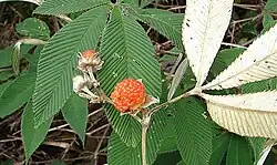 Growing to a maximum height and spread of 4 m (13 feet), it has large, handsome palmate leaves with a contrasting white underside. Small white flowers in spring and summer are followed by red or yellow ornamental fruits in autumn.[3] Full sun is required for the fruits to ripen.[4]