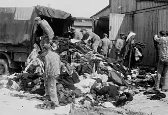The new arrivals' property was taken to barracks known as Effektenlager I and II in Auschwitz I (moved to Auschwitz II after Vrba's escape). Inmates, and apparently also some of the camp administration, called the barracks Kanada I and II because they were a "land of plenty".[50] Everything was there—medicine, food, clothing, and cash—much of it repackaged by the Aufräumungskommando to be sent to Germany.[51] The Aufräumungskommando lived in Auschwitz I, block 4, until 15 January 1943 when they were transferred to block 16 in Auschwitz II, sector Ib, where Vrba lived until June 1943.[52]