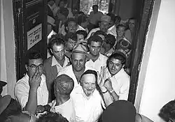 From late June and into July 1944, material from the Vrba–Wetzler report appeared in newspapers and radio broadcasts in the United States and Europe, particularly in Switzerland, prompting world leaders to appeal to Hungarian regent Miklós Horthy to halt the deportations.[12] On 2 July, American and British forces bombed Budapest, and on 6 July, in an effort to exert his sovereignty, Horthy ordered that the deportations should end.[13] By then, over 434,000 Jews had been deported in 147 trains—almost the entire Jewish population of the Hungarian countryside—but another 200,000 in Budapest were saved.[b]
