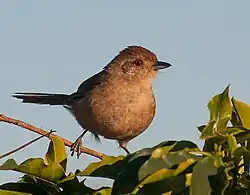 The rufous-capped antshrike's song apparently has some regional variations that have not been studied.[10] It has been described as a "slightly accelerating series of 12-15 'tjew' notes".[11] It has been written as "wah, nyah, nyah-nyah-nya-nya-nya’nya-arr"[13] and as "weepweepweepweepweepweepeepeepeep"[12]. Its calls might also vary; they include an "upslurred whistle" and a "loud raspy 'chirr' upslurred at end"[10] and "a low, rasping snarl aarrrr" and "a rising whine"[13].