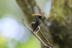 The rufous-crested coquette (Lophornis delattrei) is a species of hummingbird native to the tropical slopes of pacific South America. Due to its small size and population, it is a rare sight even within its native region. Males of the species can be easily distinguished by their striking rufous coloured spiked crests, and females, while less obvious, can be identified by their small size and rufous coloured foreheads.[3]